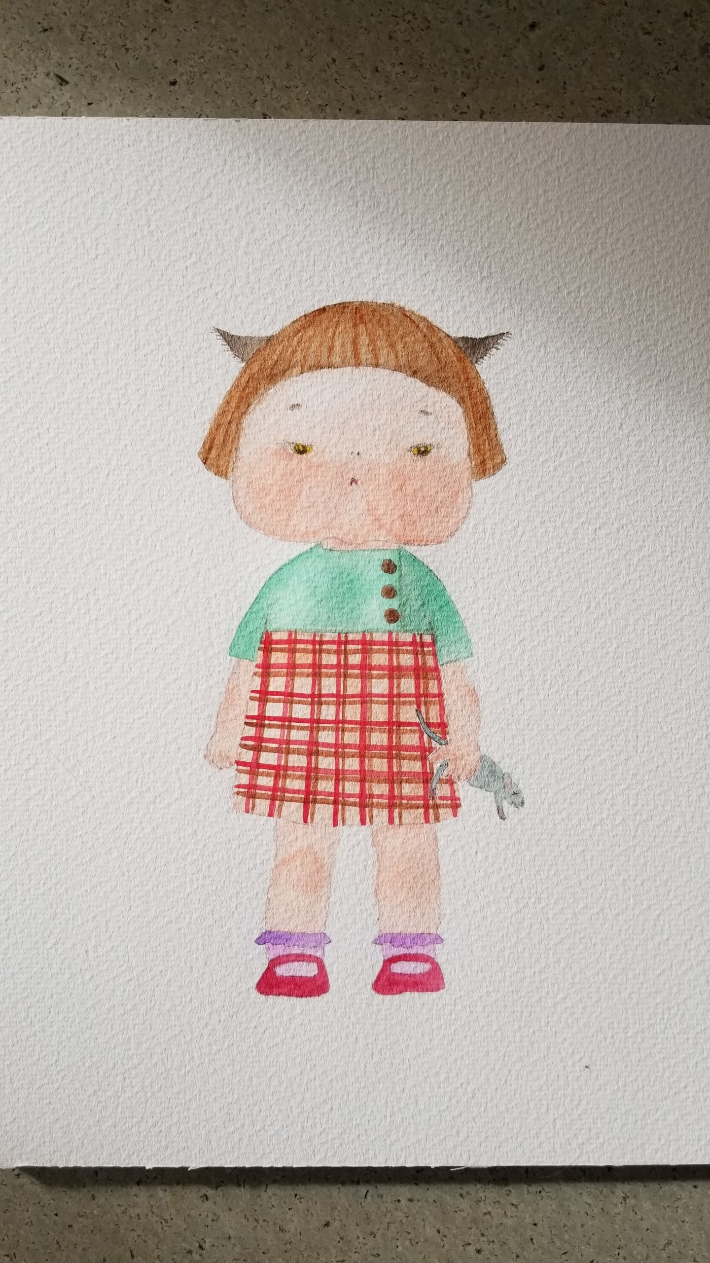 絵のタッチは写真のような雰囲気で基本的に真正面、画材は鉛筆又はペンと水彩・アクリルです。