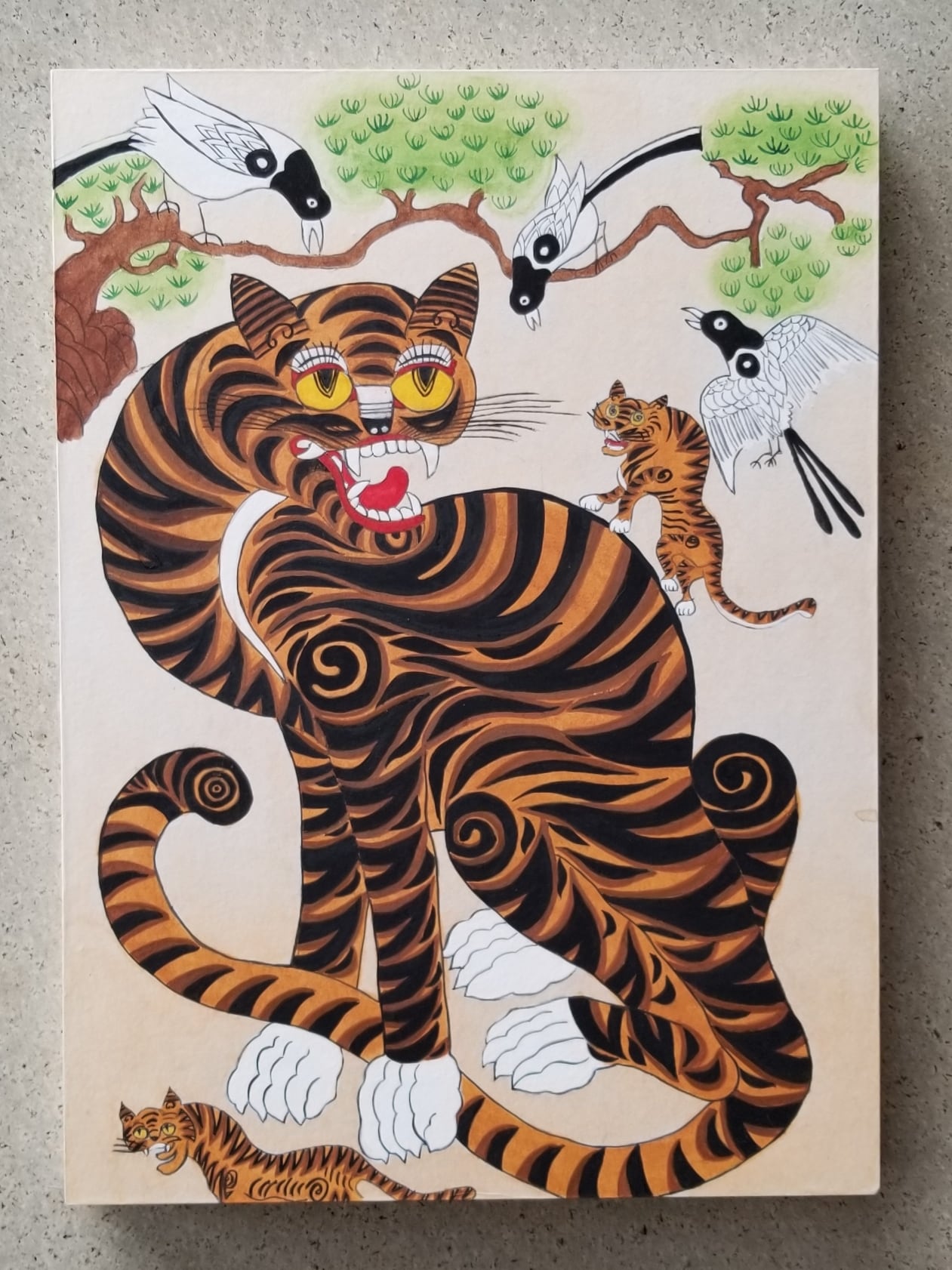 神の遣い虎と賢者のカササギ、繁栄の松と母子の縁起と招福で満ちた絵です。